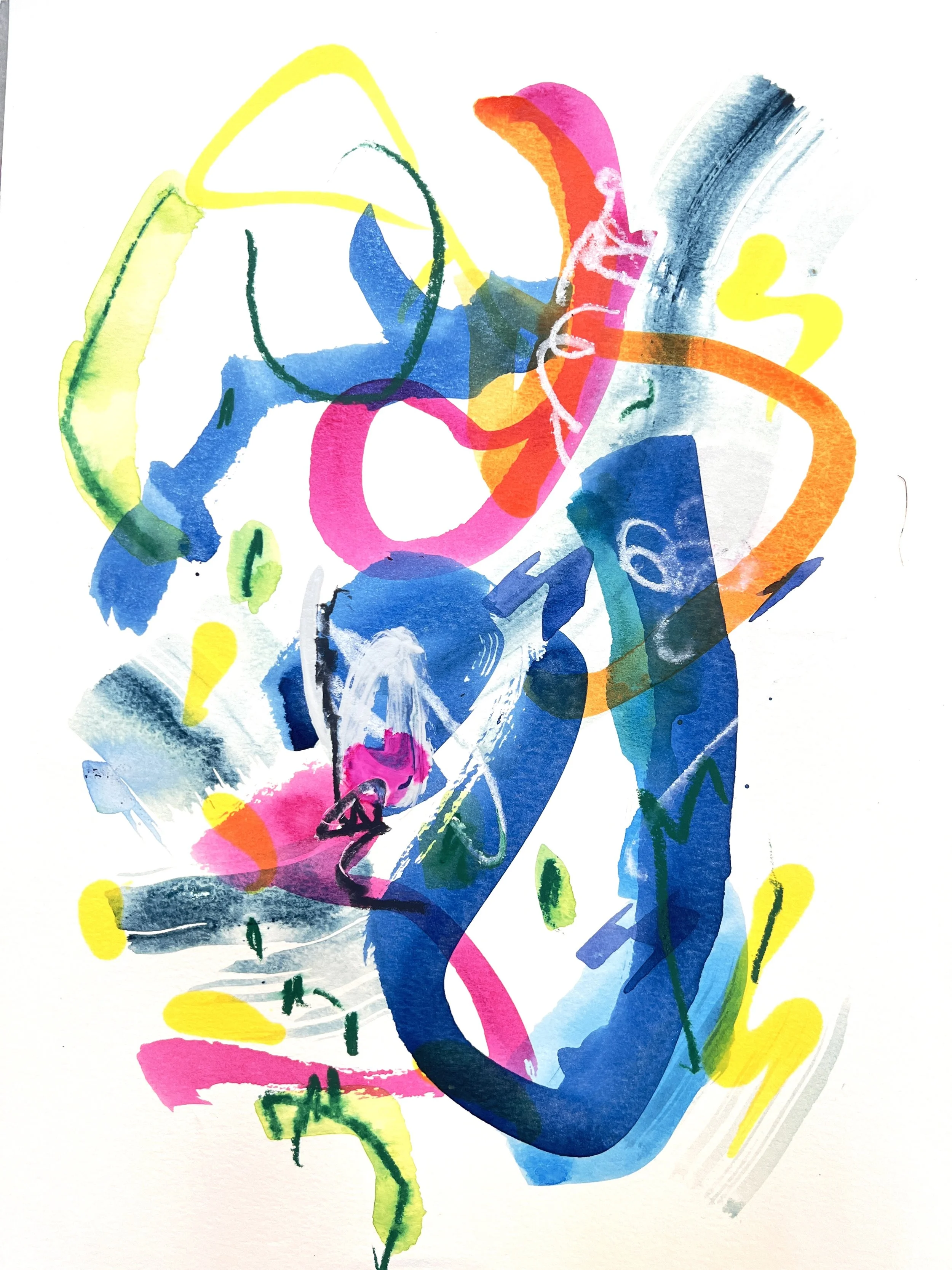 The expressive and calligraphic strokes of ink flow with intention, conveying movement and fluidity, while the watercolor hints at vibrant hues that beautifully contrast with the simplicity of the black ink.
