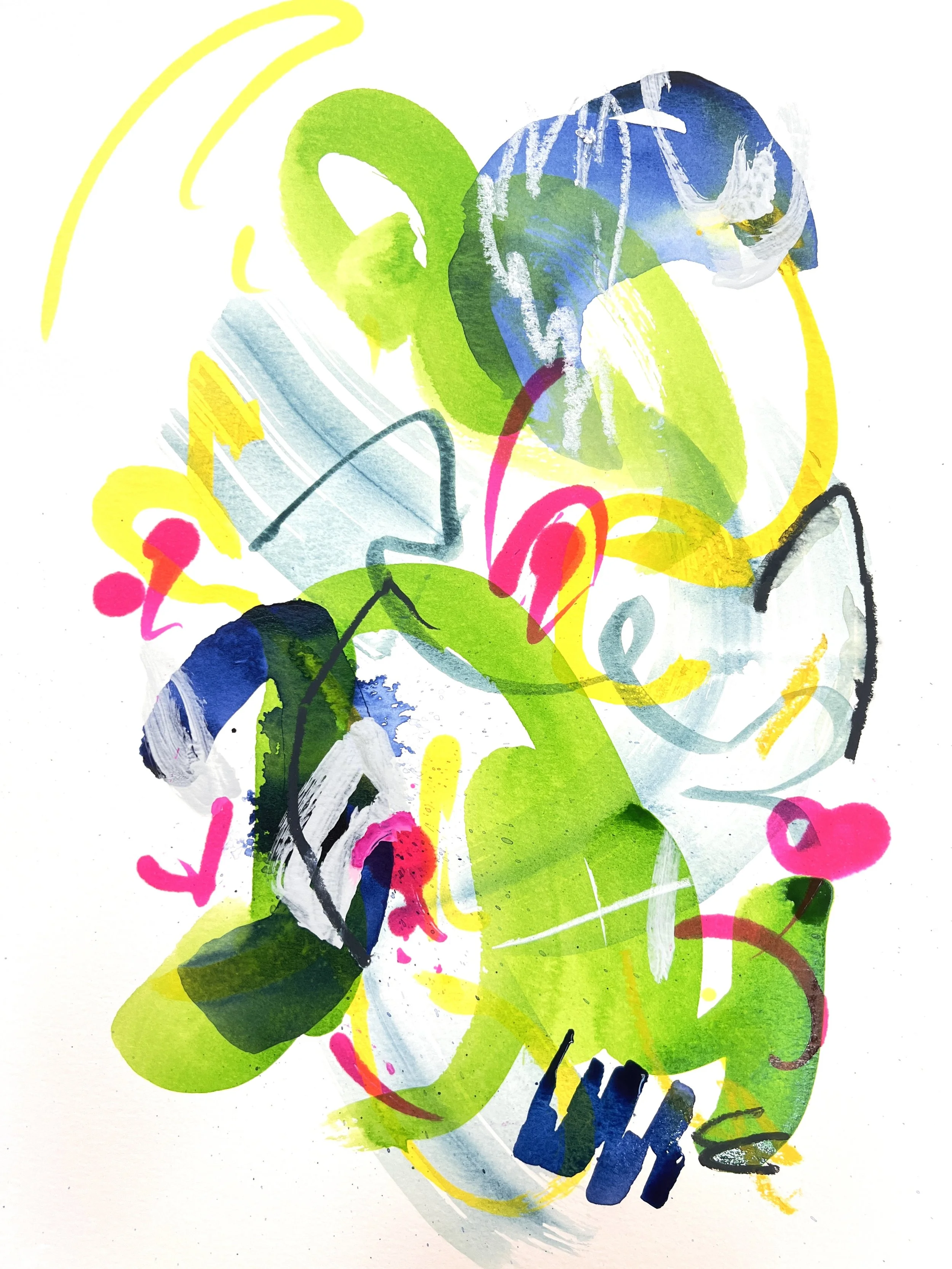 The expressive and calligraphic strokes of ink flow with intention, conveying movement and fluidity, while the watercolor hints at vibrant hues that beautifully contrast with the simplicity of the black ink.