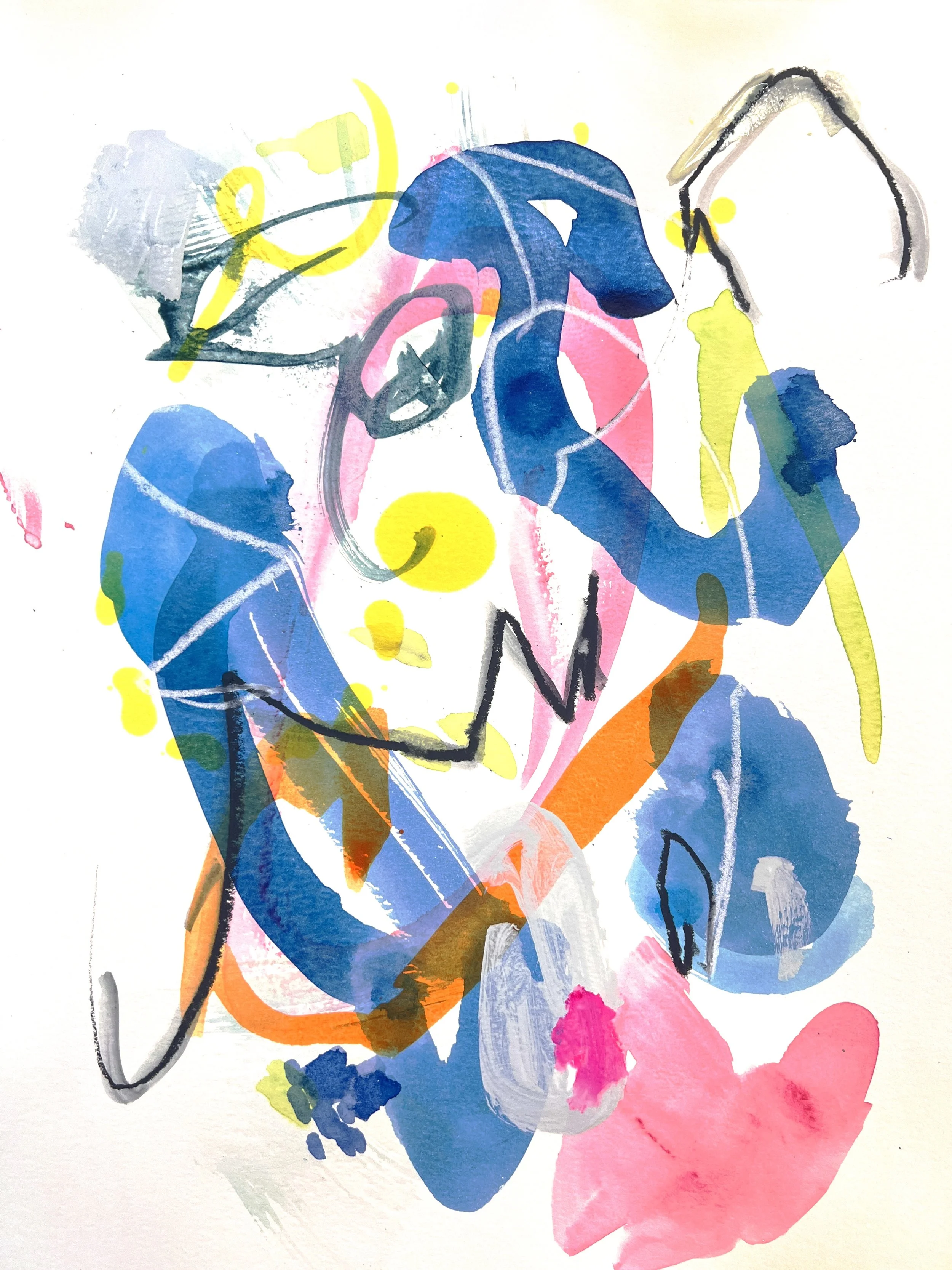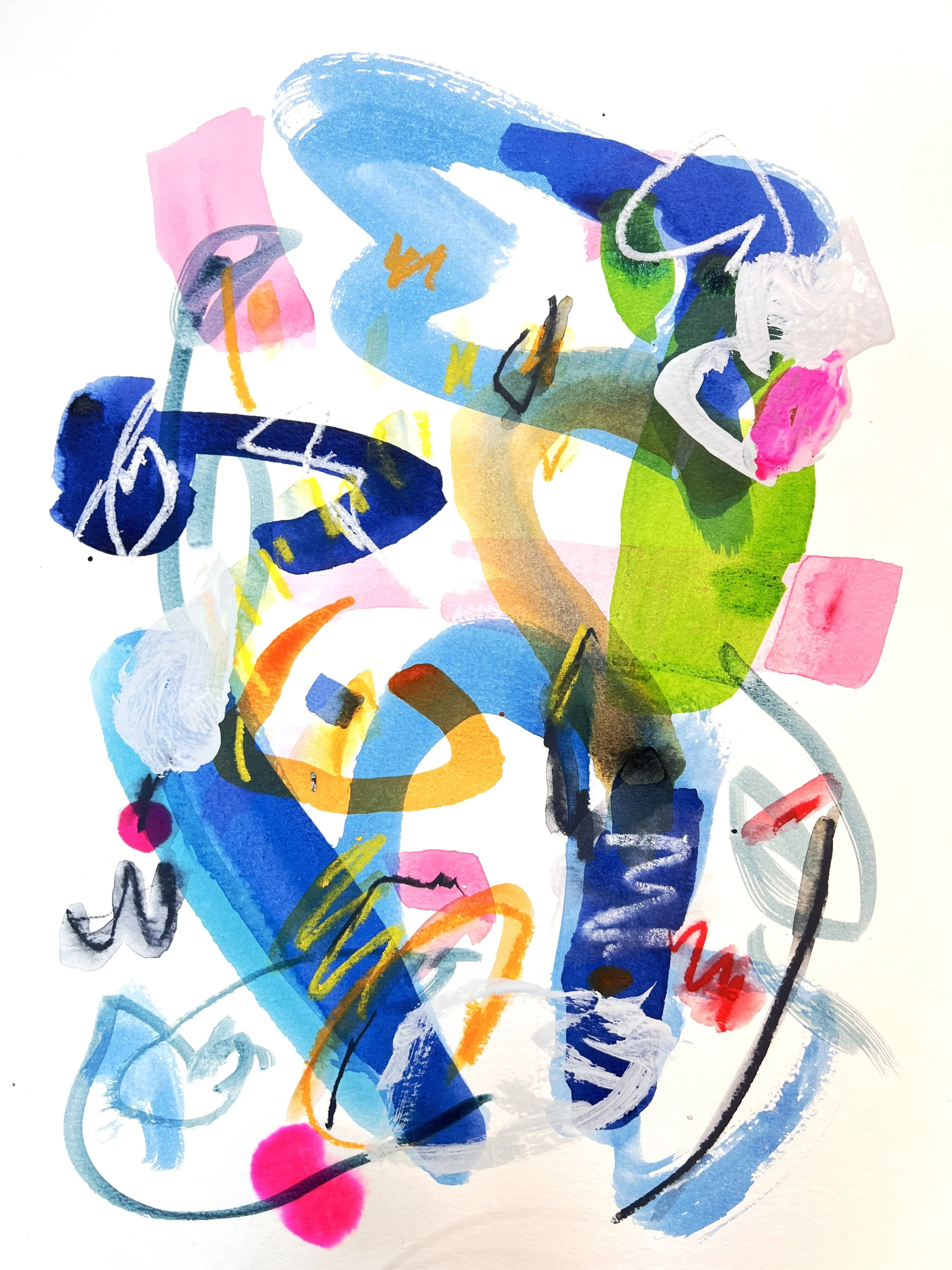 The expressive and calligraphic strokes of ink flow with intention, conveying movement and fluidity, while the watercolor hints at vibrant hues that beautifully contrast with the simplicity of the black ink.